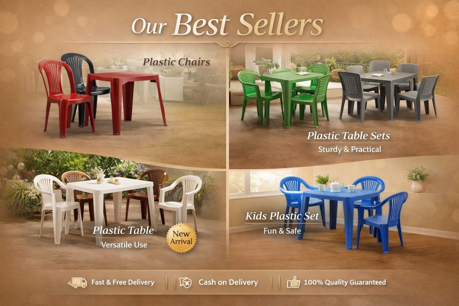 Furniture for Every Space Where Comfort meets affordability Shop Now Quality Guaranteed Upto 2 years breakage warranty Free Shipping Free shipping on bulk order 100% Money Back If the item didn't suit you Plastic Chair with Silver LegsComfortable chair with attractive colors and changing backs See Collection Baby ChairSturdy and easy to move chairs for kids specially for kindergarden and nurseries. See Collection Table RangeOur table range with different sizes and designs according to your needs. Visit the store Transform your space, transform your mood Experience the perfect blend of style and comfort with our Range of plastic furniture. Elevate your space with our smart seating solutions. Want to furnish your living? Connect with us